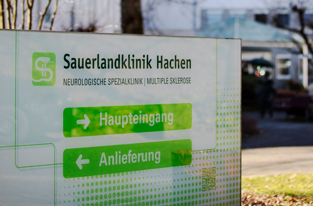 Von innen beleuchtetes Eingangsschild der Sauerlandklinik Hachen.